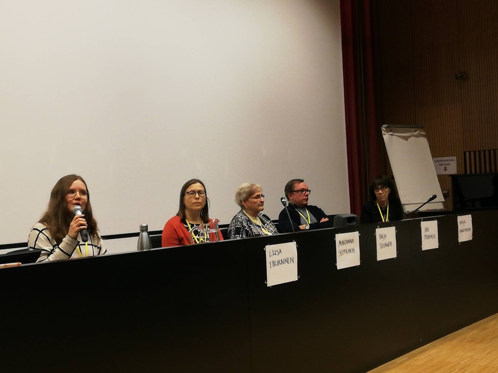 Kuva on Helsingin seminaaripäivän paneelikeskustelusta. Kuvassa on Jarin lisäksi vasemmalta lukien tutkija Elisa Tiilikainen, professori Marjaana Seppänen, kokemusasiantuntija Raija Viitanen ja psykoterapeutti Marja Saarenheimo.