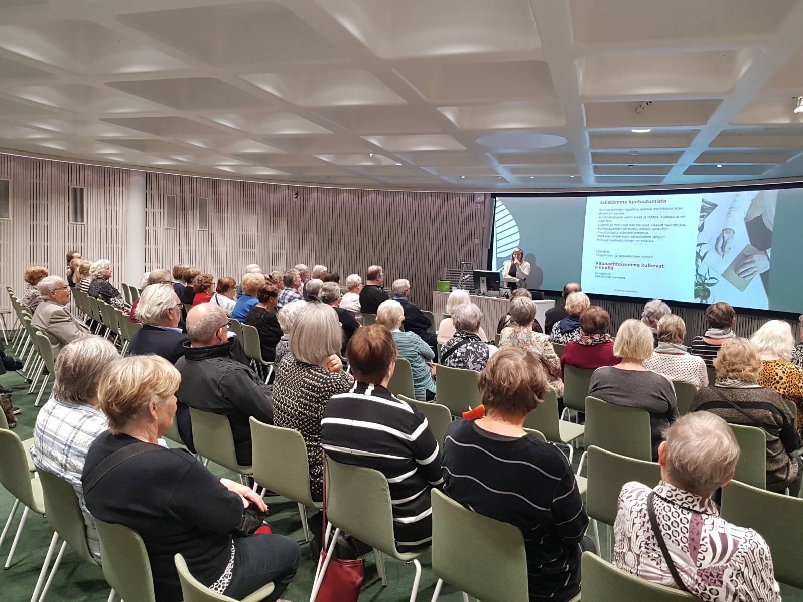 Eläkeläisliittojen etujärjestö EETU ry:n Pirkanmaan Eläkeläispiiriyhdistysten neuvottelukunta järjesti maanantaina 30.9.2019 Tampereen pääkirjasto Metsossa luentotilaisuuden aiheesta ”Elämänlaatua ikäihmisille, sydämellistä asiaa”. SoWell-hankeen väitöskirjatutkija ja tutkimusavustaja Katariina Tuominen oli tilaisuudessa puhumassa SoWell-hankkeesta ja ikääntyneiden hyvinvoinnista noin 80:lle eläkeläisjärjestöjen jäsenelle. Esitys herätti keskustelua ja sai paljon kiitosta. Saimme kuulla onnistuneemme kattavasti kokoamaan ikääntyneiden hyvinvoinnille keskeisiä aiheita esitykseemme ryhmäkeskustelujemme pohjalta. Oli myös hienoa kuulla, että osallistujien mielestä hankkeemme on tärkeän asian äärellä tarkastellessaan ikääntyneiden kokemuksia hyvinvoinnista.
