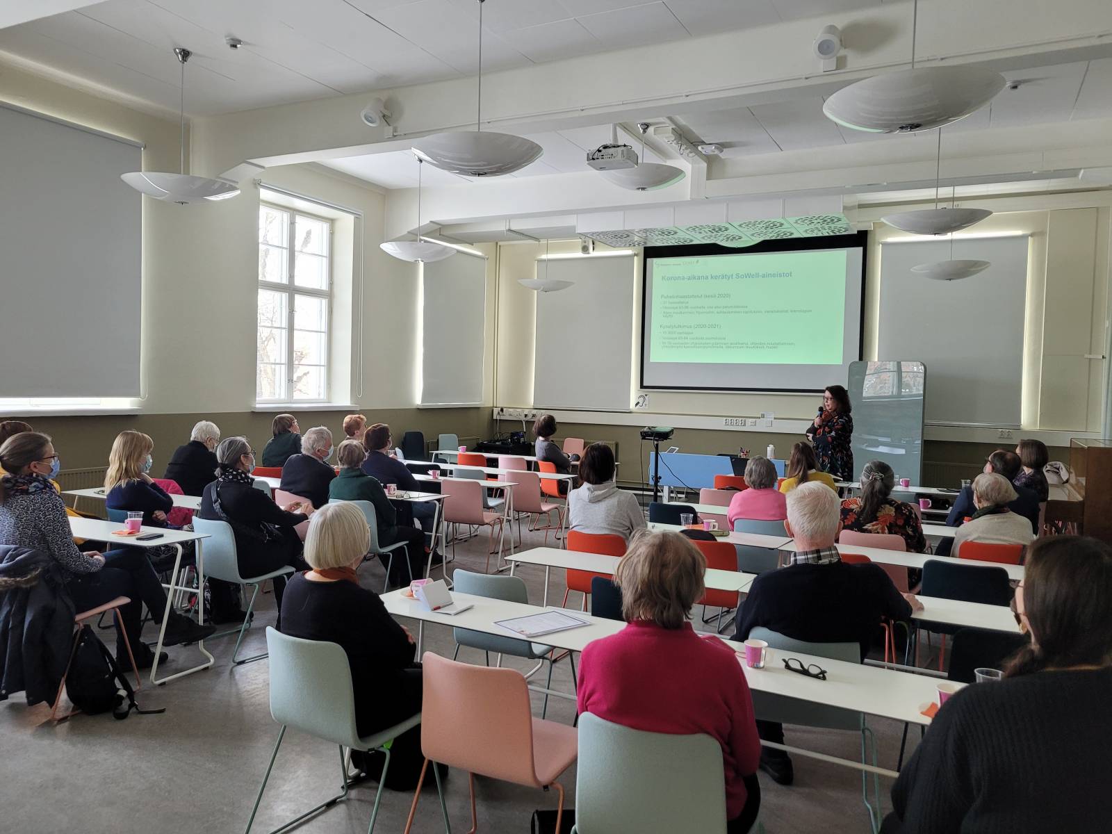 SoWell-tutkimushanke järjesti kaikille avoimen seminaarin Kulttuuritalo Laikussa torstaina 7.4.2022. Ajankohtaisia esityksiä ikäihmisten hyvinvoinnista koronapandemian aikana ja sen jälkeen oli saapunut kuulemaan parikymmentä osallistujaa.
