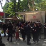 The cafeteria area illustrated the subtle presence of sponsors and the field of commerce: the brightly coloured stage, a popular spot to sip coffee in the sun, was set up to present the new special edition watch by the watchmaker Swatch.