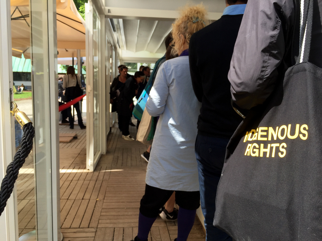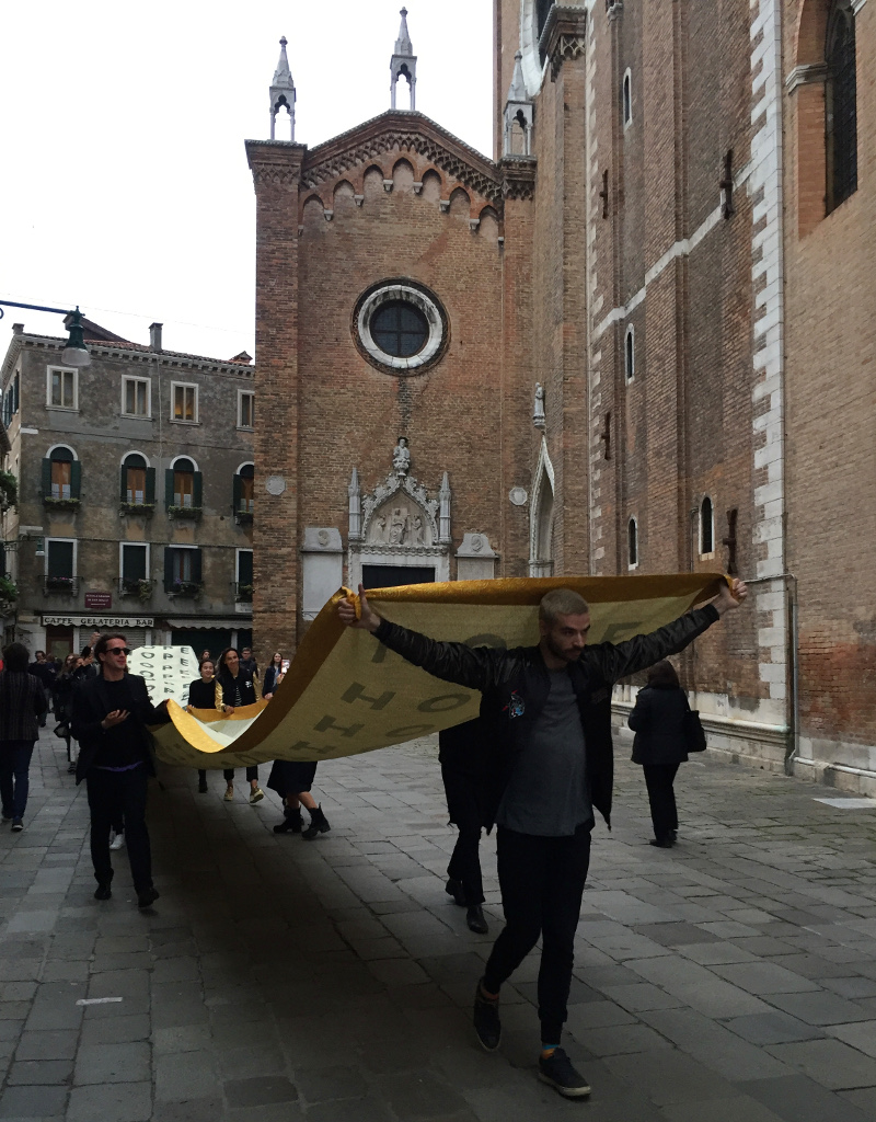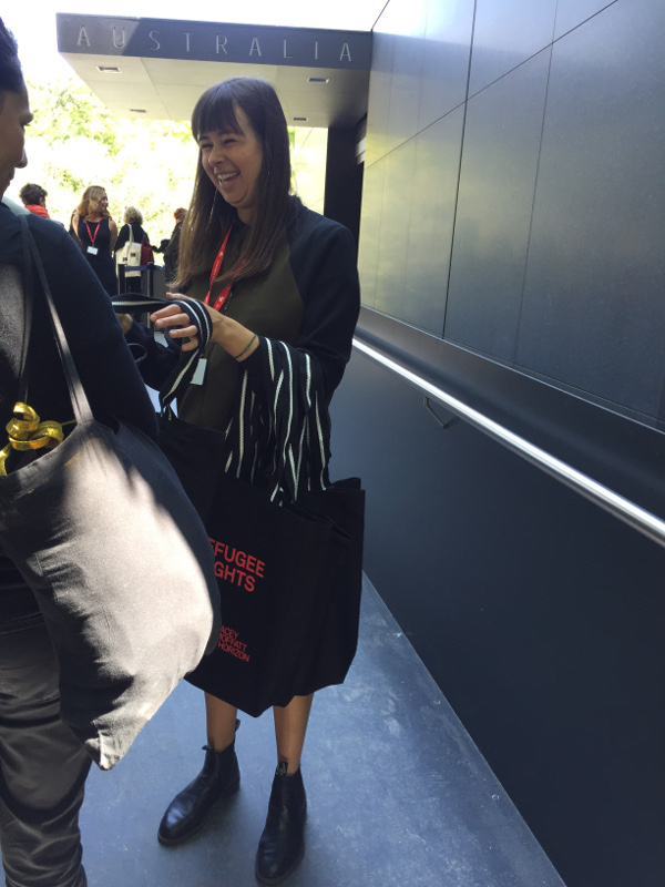 Since the pre-opening, Venice became filled with people carrying black canvas bags that were claiming for indigenous rights and refugee rights. These bags were handed out to the visitors of the Australian pavilion. Noteworthy, the majority of visitors preferred to wear the text ‘indigenous rights’, written with bright yellow letters.