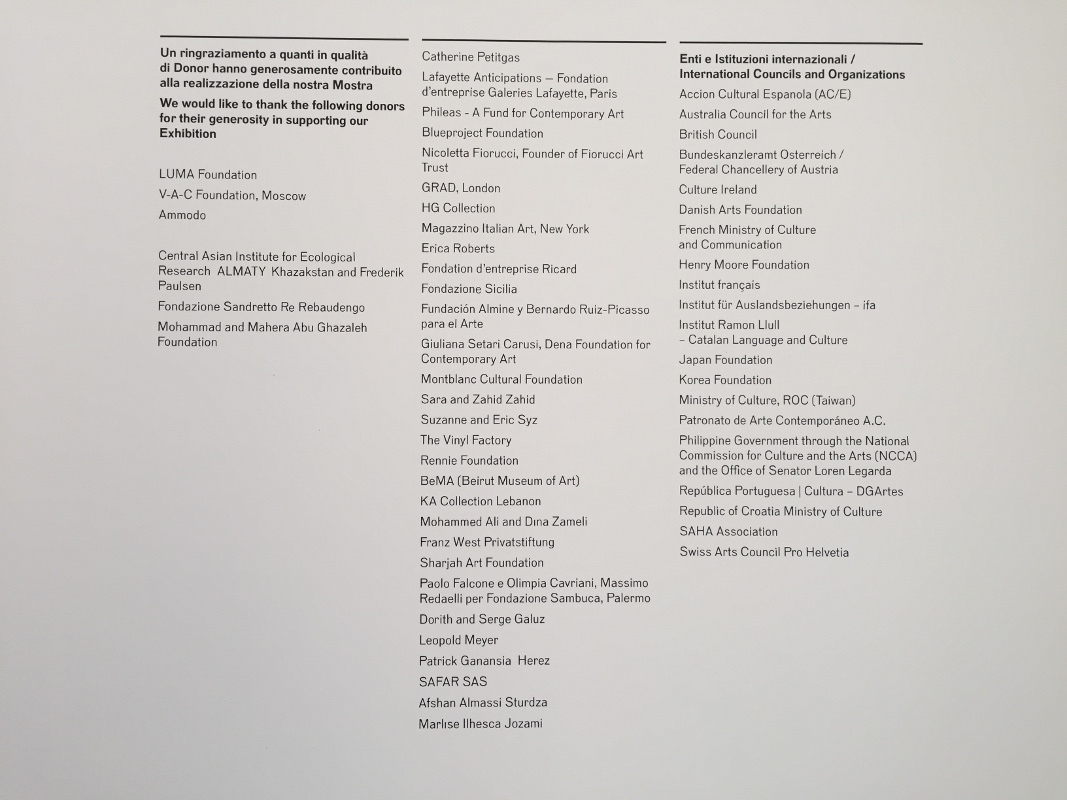 The sponsors of the International Exhibition at the Venice Biennale. Also the Russia-based, privately owned V-A-C foundation was among the main donors, noted for their “generosity”.