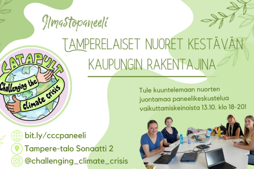Ilmastokasvatusta tutkivan CCC-CATAPULT-hankkeen nuortenryhmä järjestää 13. lokakuuta ilmastopaneelin, jossa käsitellään monipuolisesti ilmastonmuutokseen vaikuttamista. Tule seuraamaan nuorten kutsumien asiantuntijoiden keskustelua siitä, kuinka moninaisilla tavoilla ilmastonmuutokseen voi vaikuttaa. Keskustelu on helposti lähestyttävää ja ajatuksia herättävää.