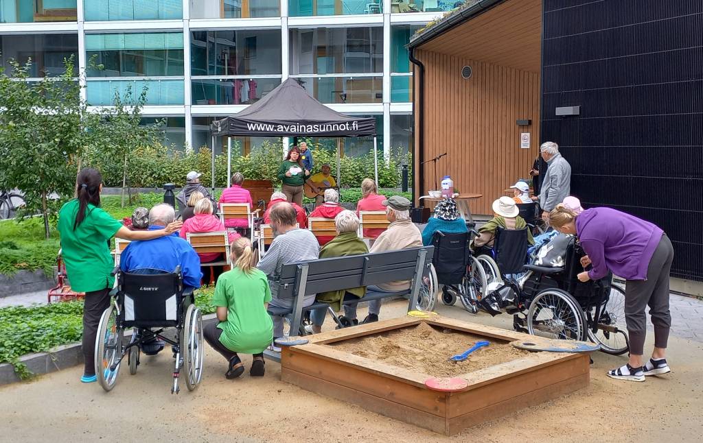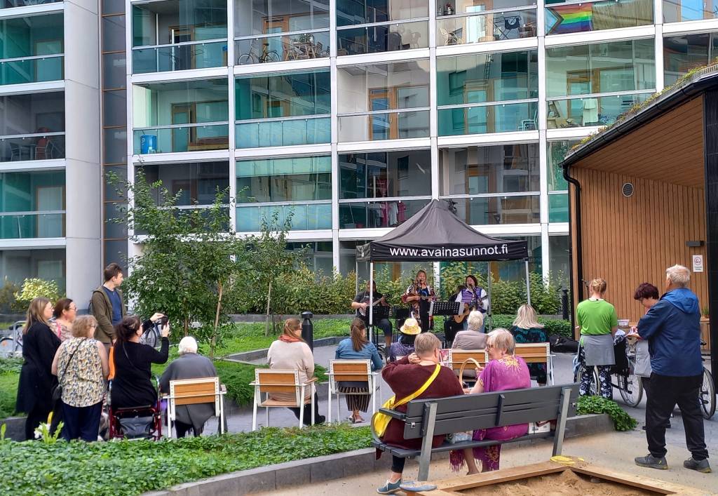 The concerts in the courtyard featured Uulu and the Ukulele Orchestra of Tuittula. People were also able to be part of writing a story with Joonas Ruokamo. A variety of yard games had been arranged in the yard, including Mölkky, Yatzy, and, at the request of the residents, a slap shot radar (lämäritutka).