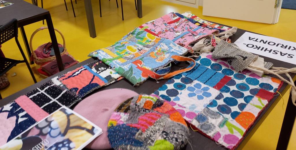 The Kaarikarkelot event included various workshops, such as Japanese Sashiko embroidery; a music instrument workshop on recycled materials; and chair dancing. In addition, bingo was arranged for the residents of the care home. In a small info market, there was recycling and digital advice, the introduction of the shared car OmaGo, and the presentations of Tampere University’s GreenerAge project and JUSTSPACES Research Network.