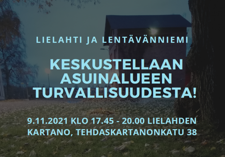 Keskustellaan asuinalueen turvallisuudesta: Lielahti ja Lentävänniemi 9.11.2021 29.10.2021 Tapahtumat Uutiset