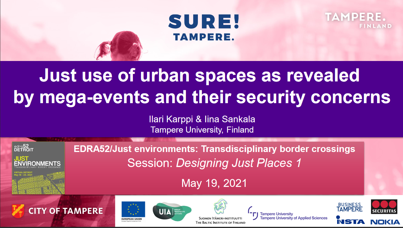 Keskiviikkona 19.5. Ilari Karppi ja Iina Sankala pitivät esityksen kansainvälisesti arvostetussa EDRA-konferenssissa (The Environmental Design Research Association). 52. kerran järjestettävän konferenssin (19.-24.5.2021) teemana oli oikeudenmukaisuus kaupungeissa, ”Just Environments”. Tämän vuoksi myös SURE-tuloksia hyödyntävän Just Use of Urban Spaces As Revealed By Mega-Events and Their Security Concerns –esityksen keskiössä oli kaupunki- ja tapahtumaturvallisuuden edistämiseen sekä näissä prosesseissa hyödynnettävien teknologioiden käyttöön liittyvät sosiaalisen ja yhteiskunnallisen hyväksyttävyyden kysymykset.