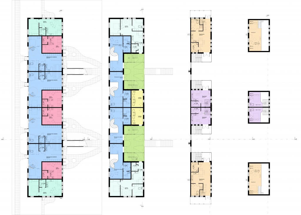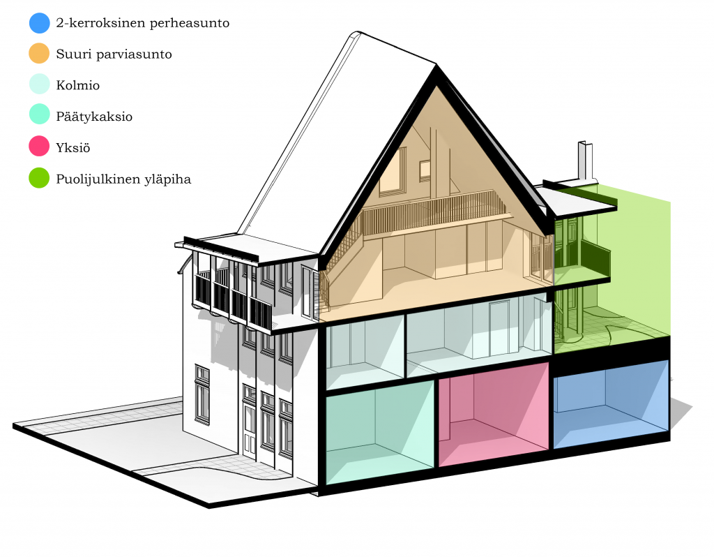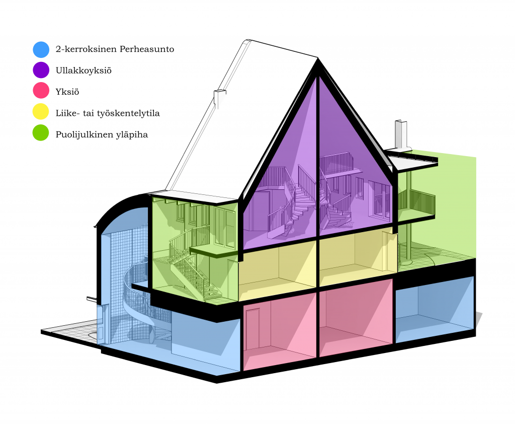 - Perheasuntojen makuutilat voi rajata asukaslähtöiseti kevyillä väliseinillä tai verhoilla.