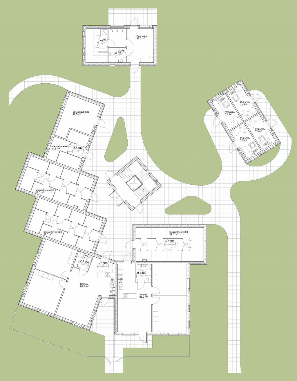 Ulkorakennukset rajaavat viihtyisän pihatilan ja luovat viihtyisän kotiympäristön myös lapsille. Ulkosaunarakennuksessa on mökkeilyn tuntua. Ajaton detaljointi ja kunnolliset, kouriintuntuvat materiaalit ottavat innoituksensa mutkattomasta kansanrakentamisesta. Ulkorakennukset voivat olla yhteisiä useamman kerrostalon kesken, ja ne sopeutuvat asukaslähtöisiin käyttötarkoituksen muutoksiin.