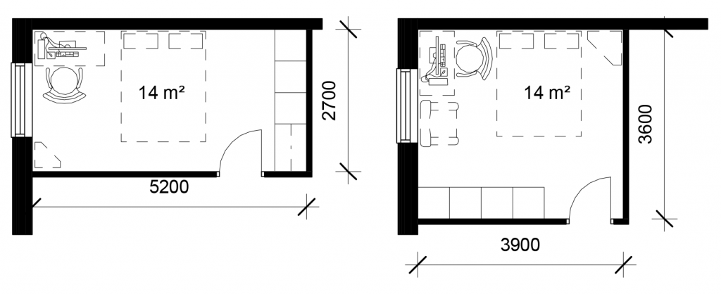 Minkälaisia asuinhuoneiden pitää siis olla, jotta ne olisivat monikäyttöisiä ja sopeutuisivat asumisen muutoksiin? Makuuhuonetta suunnittelevalla arkkitehdilla on käytössä neljä työkalua: huoneen pinta-ala, pituuden ja leveyden suhde sekä kulkuaukkojen ja ikkunoiden ja kiintokalusteiden sijanti.