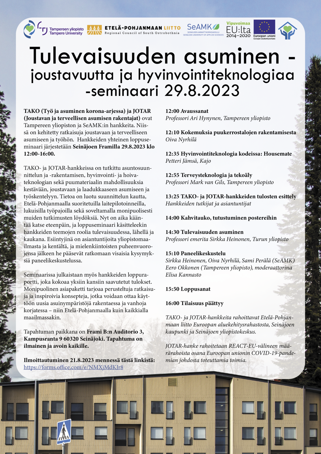 TAKO- ja JOTAR-hankkeissa on tutkittu asuntosuunnittelun ja -rakentamisen, hyvinvointi- ja hoivateknologian sekä puumateriaalin mahdollisuuksia kestävään, joustavaan ja laadukkaaseen asumiseen ja työskentelyyn. Tietoa on luotu suunnittelun kautta, Etelä-Pohjanmaalla suoritetuilla laitepilotoinneilla, lukuisilla työpajoilla sekä soveltamalla monipuolisesti muiden tutkimusten löydöksiä. Nyt on aika kääntää katse eteenpäin, ja loppuseminaari käsitteleekin hankkeiden teemojen roolia tulevaisuudessa, lähellä ja kaukana. Esiintyjinä on asiantuntijoita yliopistomaa-ilmasta ja kentältä, ja mielenkiintoisten puheenvuorojensa jälkeen he pääsevät ratkomaan visaisia kysymyksiä paneelikeskustelussa.