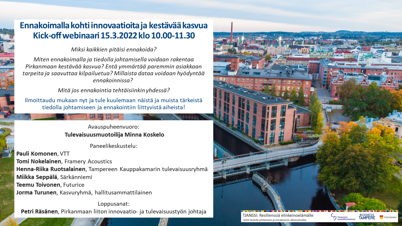 Ennakoimalla kohti innovaatioita ja kestävää kasvua –webinaari on TJANSSI-hankkeen kick off –tapahtuma. Avauspuheenvuoron piti tulevaisuusmuotoilija Minna Koskelo, joka kertoi ennakoinnista ja sen merkityksestä organisaatioiden kilpailuedun luomisessa (ei tallenteessa puhujan toiveesta). Lisäksi paneelissa olivat keskustelemassa tulevaisuustiedosta ja sen hyödyntämisestä: