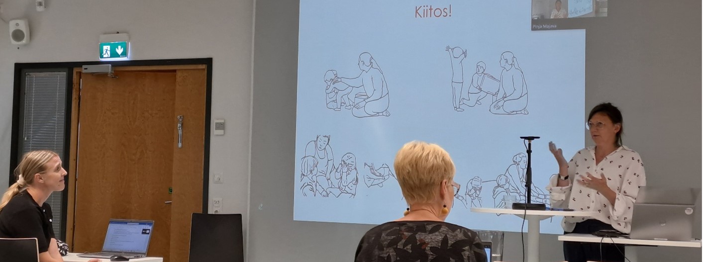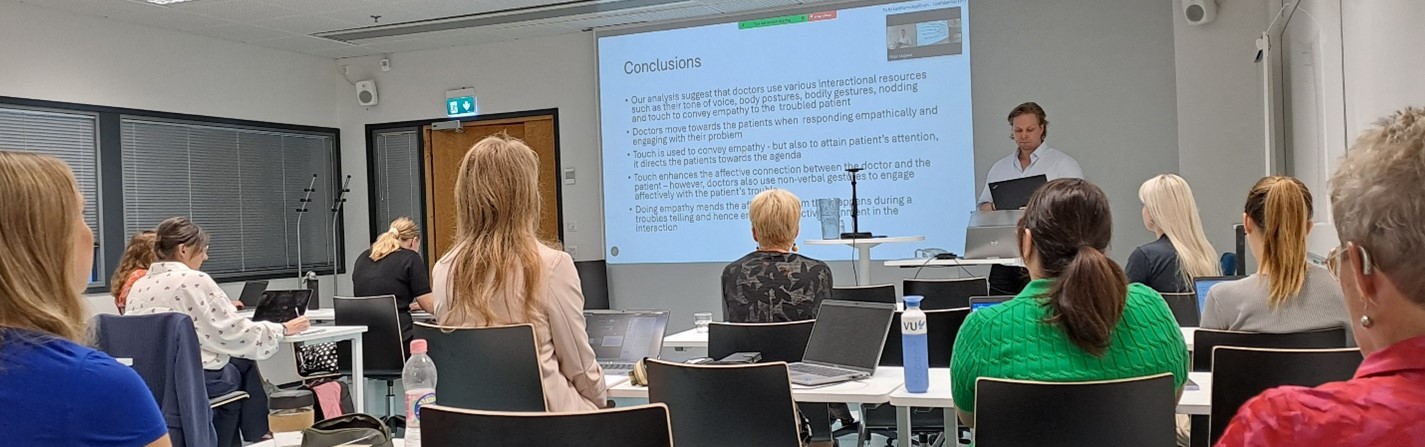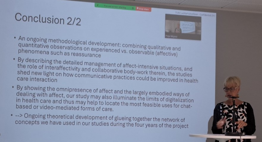 Next, the floor was given to the project’s researchers. Dr Julia Katila started the round of presentations bringing forth two flagship studies of the project: Fear and pain in pediatric dental encounters and Affective participation and touch in postnatal health care check-ups. This was followed by the PhD researcher Juhana Mustakallio, who gave a presentation on Touch and embodied empathy in medical consultations. Thereafter, Dr Tuuli Turja presented multimethodological findings, combining survey and observation data, on Affect-laden problem-telling and perceived reassurance. Concluding the session, Dr Aija Logren delivered a presentation on Invoking worry in primary care consultations.