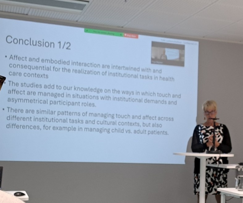 First, Professor Johanna Ruusuvuori, Professor of Social Psychology and the PI of the project, presented the multimethod study design of Touch & Affect and the key findings from the past four years. By examining how professionals and patients manage touch and affect in healthcare interaction through authentic observational video data from Finland, the UK and China, the project has generated knowledge critical for developing both best practices in professional–patient encounters and user-friendly digitalized healthcare services.