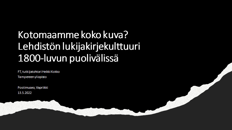 Kiinnostaako Translocalis ja paikalliskirjekulttuuri? Heikki Kokon yleisöluento suomenkielisen lehdistön paikalliskirjekulttuurista 1800-luvun puolivälissä on nähtävissä kokonaisuudessaan Youtubessa. 13.5.2022 Museokeskus Vapriikissa järjestetty tilaisuus oli osa Postimuseon Aamukahvi ja tuore lehti -näyttelyn ohjelmaa.