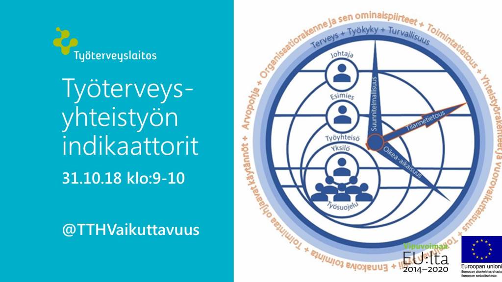 Webinaarissa 31.10. klo 9–10 kerrotaan, miten työterveysyhteistyöstä saadaan toimivaa ja vaikuttavaa. Vaikuttavuutta työterveysyhteistyöllä – vaikuttavan työterveysyhteistyön indikaattorit ja hyvät käytännöt -osahanke esittelee keskeiset tulokset toimivasta työterveysyhteistyöstä: hyvistä käytännöistä ja vaikuttavuuden mittaamisesta. Webinaari on maksuton. Ilmoittaudu 28.10. mennessä.