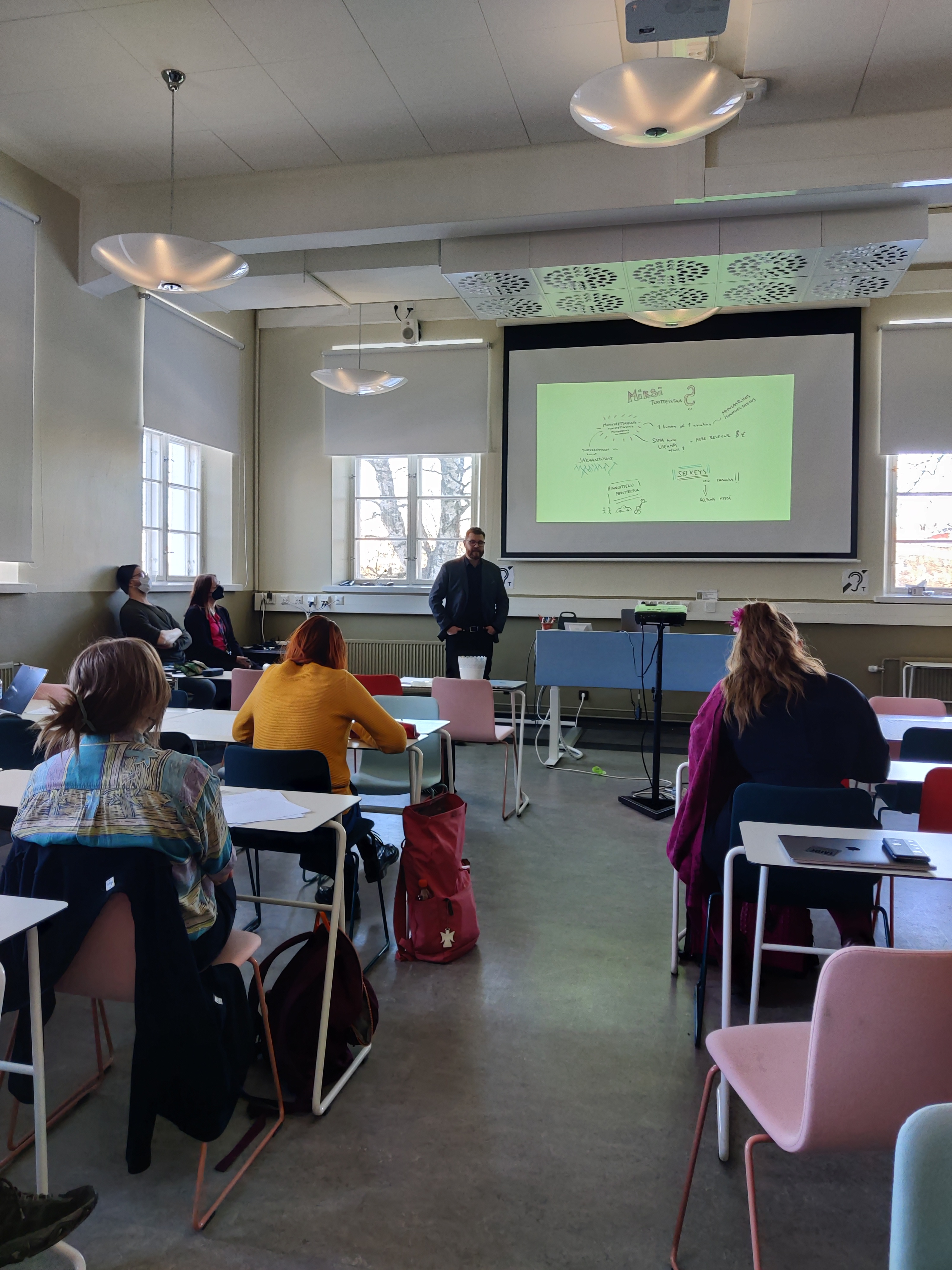 Kulttuuriosuuskunta Uulun puheenjohtaja Joonas Keskinen luotsaa myös Suomen suurinta kulttuurikasvatusohjelma Taidetestaajia. Näkökulmaa hänelle on kertynyt niin tuotteiden myynnistä kuin ostamisesta kulttuurin kentällä, mutta alustuksessa Joonas keskittyi kuntasektorin erityispiirteisiin asiakkaana. Vuoropuhelu Mariannen alustuksen kanssa oli pitkälti yhteneväinen, sillä tuotteistamisen edut tuottajapuolella näkyvät juuri palvelun monistettavuuden ja muistettavuuden eli sitä kautta myös modulaarisuuden ja muunneltavuuden etuina. Samalla tuotteella voi ihannetapauksessa olla useampia tekijöitä, jolloin yhden tuotteen suunnittelun eli tuotekehityksen kulut jakaantuvat tasaisemmin ja parempien toteutusmahdollisuuksien kautta tuottaa enemmän lisäarvoa ja tuottoa.