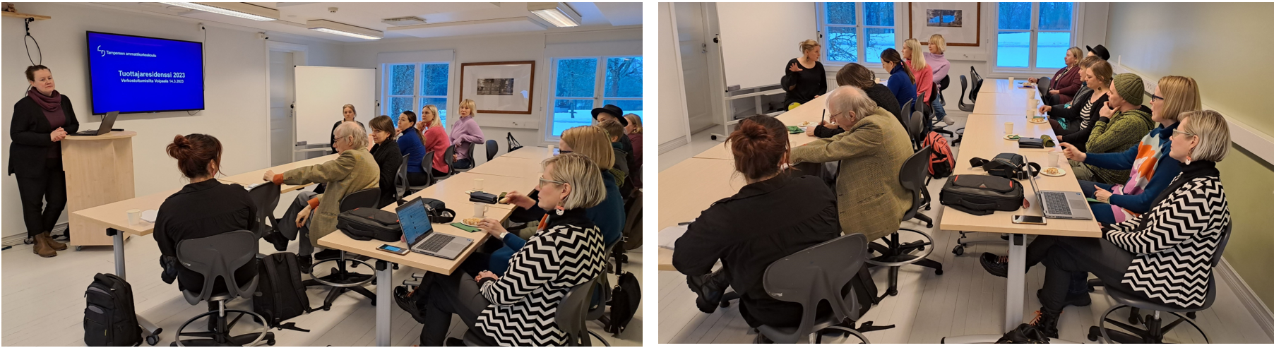 Residenssijakso päättyi Voipaalan taidekeskuksessa järjestettyyn verkostoitumisiltaan 14.3. Valkeakosken ja Akaan taide- ja kulttuurialan toimijoille. Illan aikana jatkettiin jo hyvin kevään 2022 kuntakierroksella alkanutta kohtaamisten sarjaa. Hanke-esittelyiden jälkeen alkoikin parinkymmenen alueen toimijan kiivas pienryhmäkeskustelu siitä, mitä tarpeita alueen kulttuuritoimijoilla on ja miten voitaisiin lisätä ja kehittää kulttuuritoimijoiden yhteistyötä. Tarve kohtaamiselle selkeästi oli olemassa ja on varmasti myös jatkossa, joten verkostoitumisilta järjestetään myös Akaan residenssijaksolla, keskiviikkona 24.5.2023. Kuntien edustajien tuskaa voitaneen helpottaa sillä, että kehittämistarpeet ja toimintapyynnöt eivät ole ainoastaan heidän kontollaan toteuttaa, vaan tässä tarvitaankin juuri sitä alueellista yhteistyötä ja myös toimijoiden omaa aktiivisuutta asioiden kehittämiseksi!