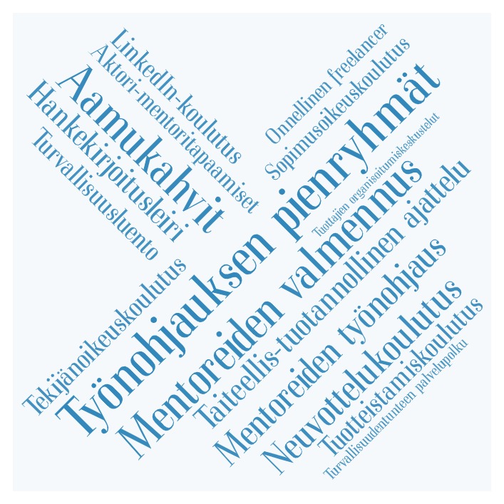 ovat tuoneet mielestämme huikean volyymin, 695 osallistumiskertaa kaikkiaan hankkeen eri aktiviteetteihin. Eri osallistujia on 151, joista ahkerimmat ovat olleet mukana jopa 25 kertaa tilaisuuksissamme. Kuulumisiamme tahtoo lukea jo 350 uutiskirjeen tilaajaa. Toimintamenetelmiä tarkastellessa tarkemmin lukemat ovat myös upeat: mentoreita koulutimme 8, jotka luotsasivat onnistuneen puolen vuoden aikana 22 aktoria urapolkujen ja työnteon eri käänteissä. Pienryhmämuotoisia työnohjausryhmiä kokosimme vuoden aikana 3, joissa oli yhteensä 16 osallistujaa. Näistä kuulemme tarinoita vielä alkuvuoden aikana.