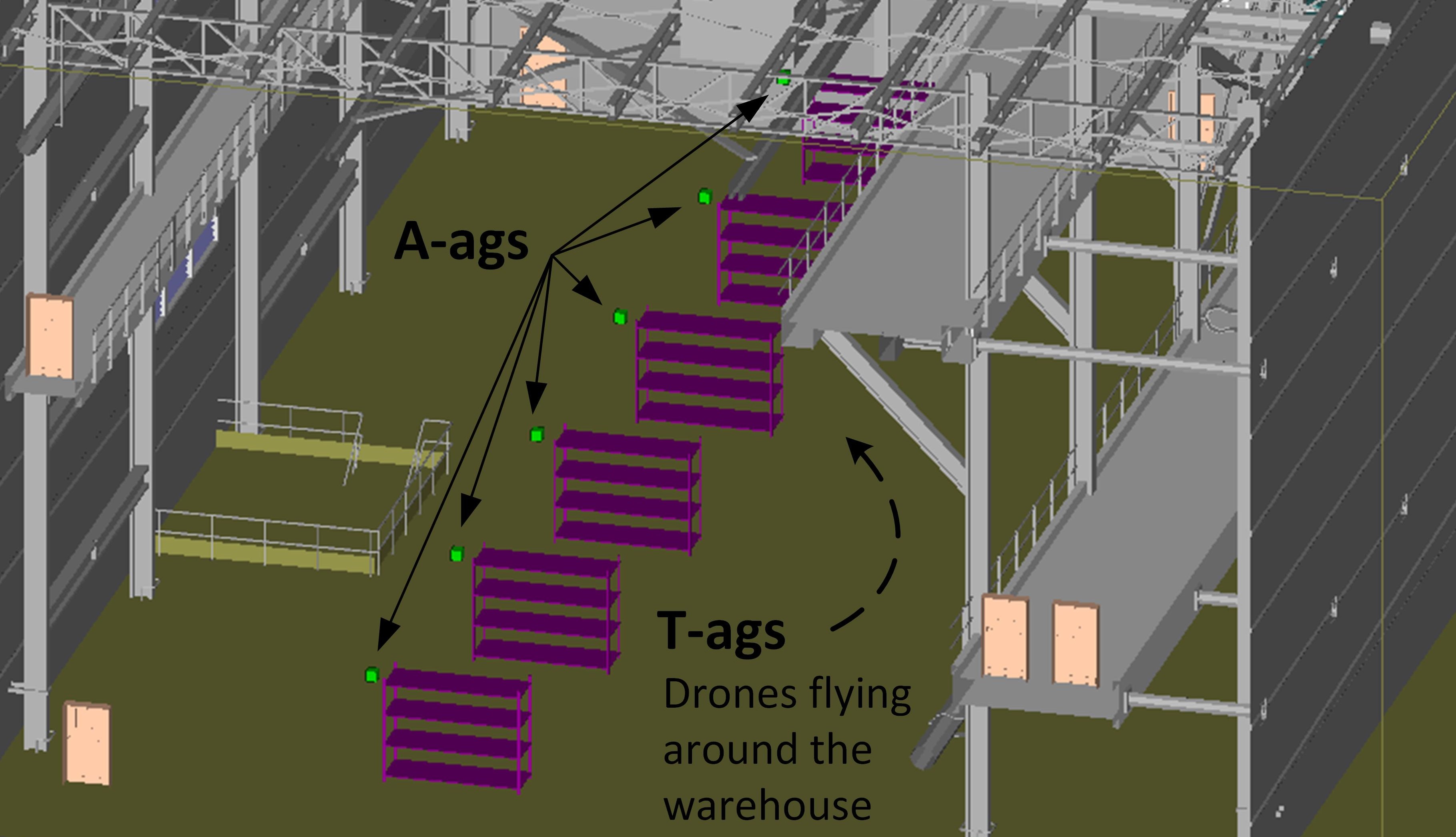 Figure 2. An illustration of the applied industrial factory warehouse for CPS with collinear deployed anchor agents (A-ags)