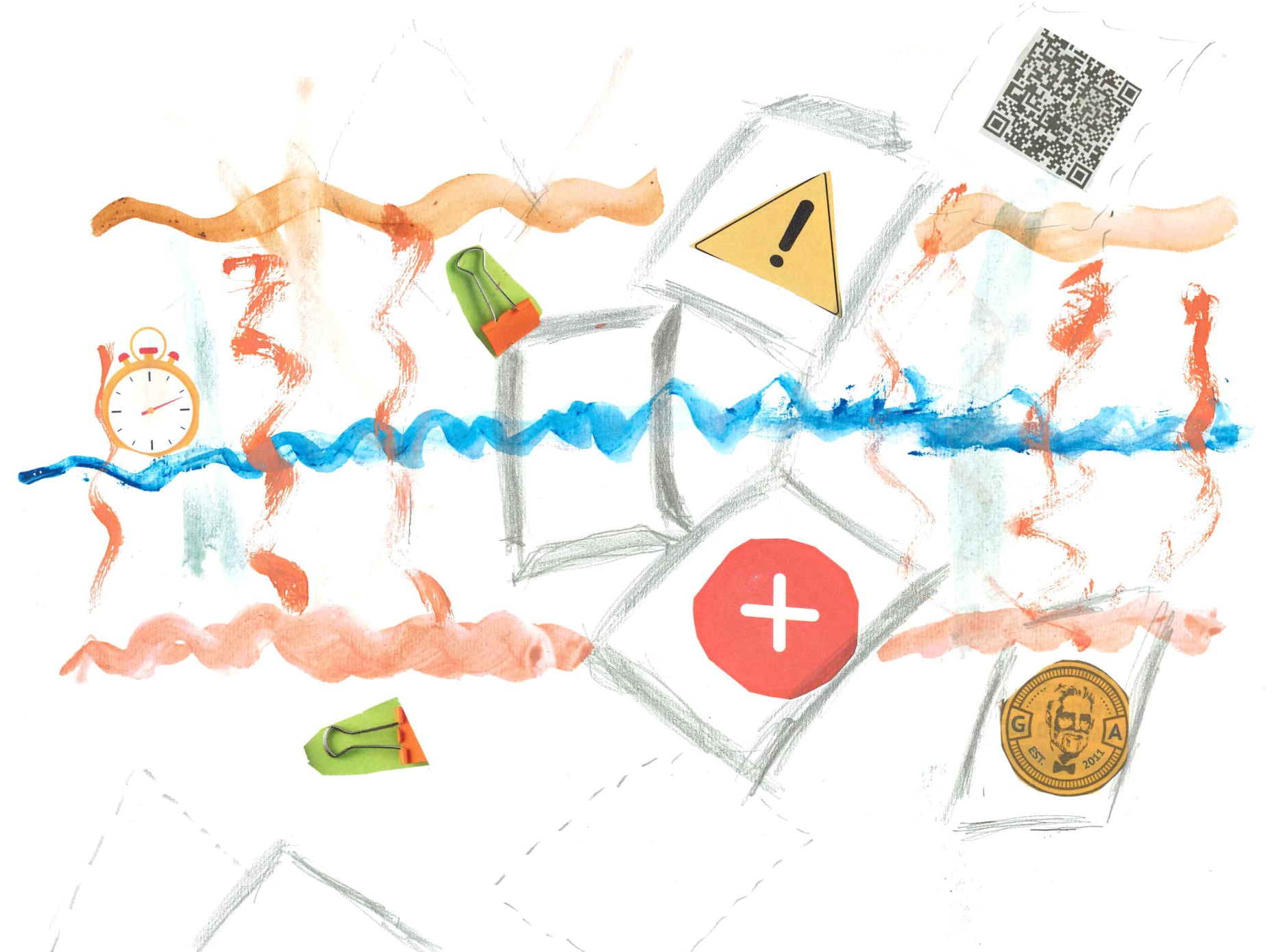 During the art workshop, through painting, drawing, and collage, we explored the concept of educational knowledge and its aspects we find meaningful. The artistic expression enabled us to visualise our understandings but also to deepen our approach to our interdisciplinary research inquiry. The discussions around the produced works were particularly insightful, deepening our shared meaning-making around the abstract concepts and relations between knowledge, students, and higher education. We talked about fields, paths, lines, threads, as well as objects, frames, signs, and structures of knowledge. Our works featured representations of growth, complexity, and diachronic aspects of different forms of knowledge: formed, digital, vague, and erased. Connections, transitions, relations, disruptions were also highlighted in our reflections.