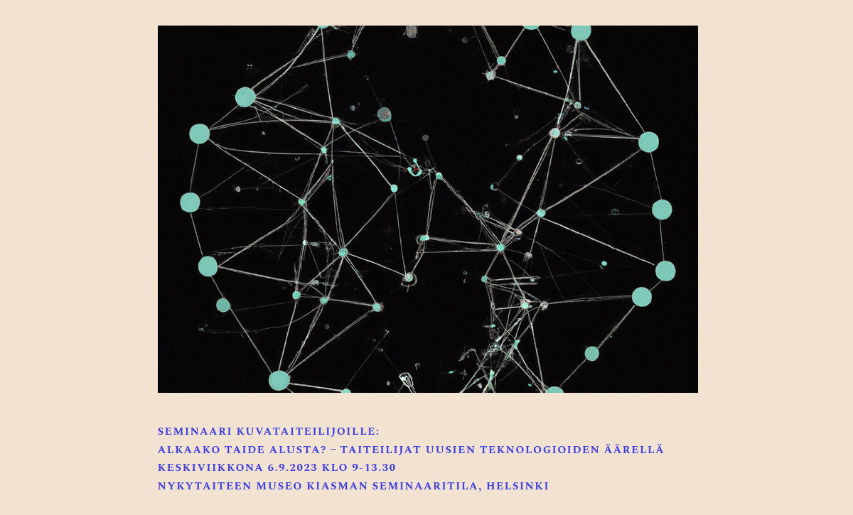 Kansallisgallerian ja Kuvataiteen talon järjestämä ”Alkaako taide alusta? Taiteilijat uusien teknologioiden äärellä” -tilaisuus on suunnattu Suomessa työskenteleville taiteilijoille. Valokeilassa Urban AI Art -taideteos ja kuvataiteilija Jussi Lahtinen