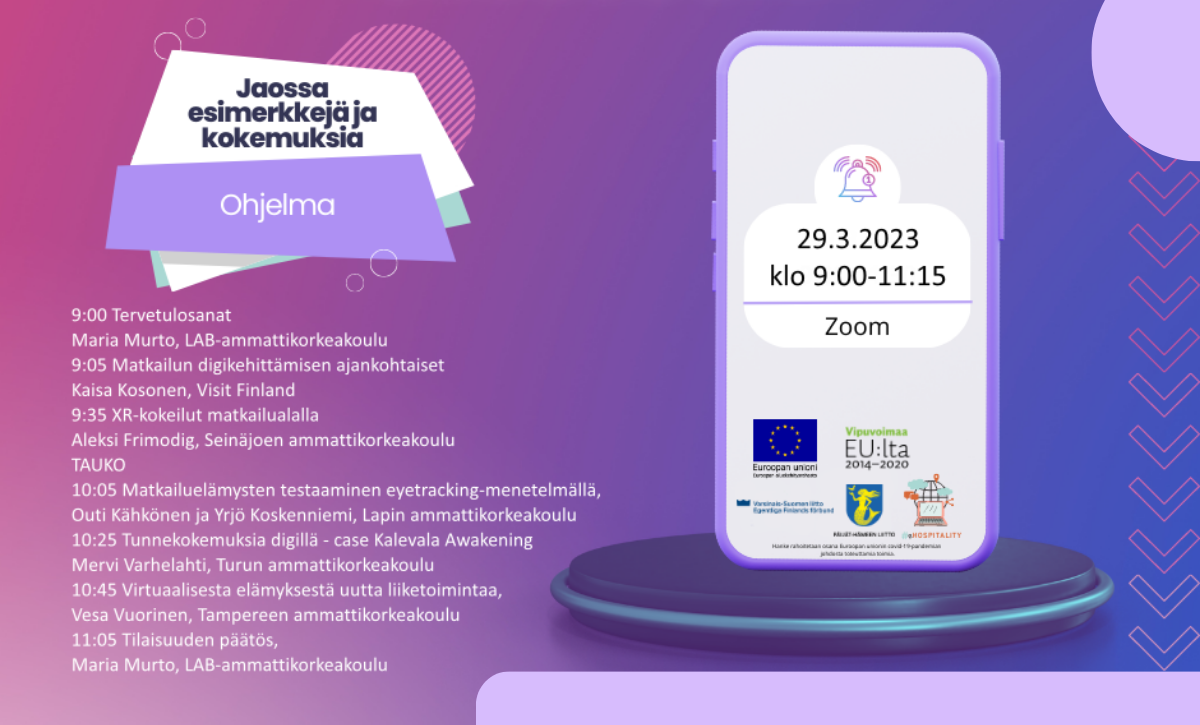Tilaisuuden jälkeen sinulla on parempi ajatus, mitä kaikkea digillä voi tehdä matkailuelämyksissä. Kenties jotakin esimerkkiä voisit hyödyntää omassa yritystoiminnassasi tai projektissa?