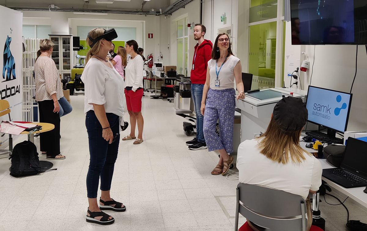 RoboAI Healthin projektitutkijat esittelivät fysioterapiaopettajille erinäisiä mahdollisuuksia virtuaalikuntoutuksen toteutuksista. Kokeiltavana oli niin talon omaa tuotantoa, kuin kaupallisia mahdollisuuksia sekä kansainvälisten yhteyksien kautta saatuja alustoja. Lyhyiden esittelyjen jälkeen opettajat pääsivät itse kokeilemaan liikkumista immersiivisessä ympäristössä ja pohtimaan vapaasti toteutuksen hyötyjä ja tavoitteenmukaisuutta.