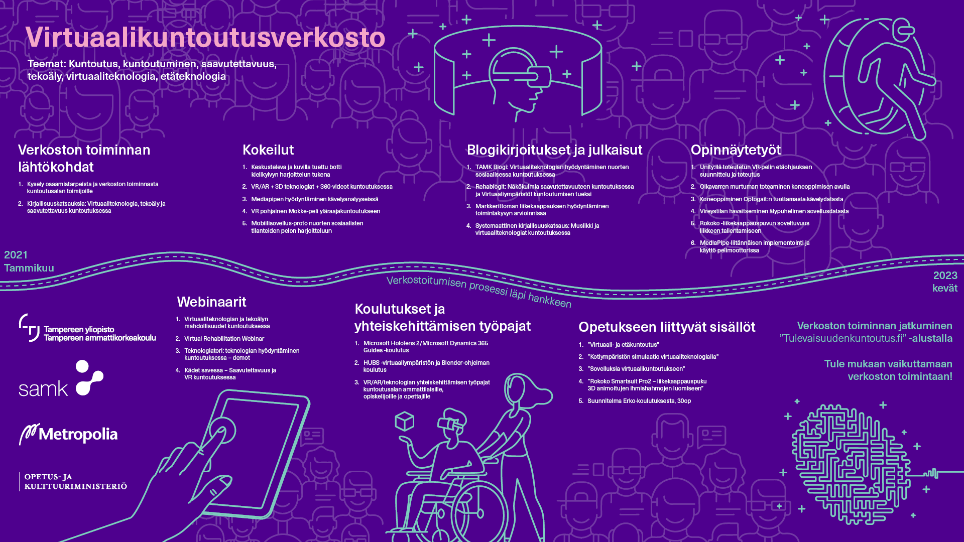 Verkoston seuraava tapahtuma on Webinaari 13.9.2023 klo 12.30-15.00 (etänä). Webinaarin teemoina ovat Tekoälypohjainen liikeanalyysi; Virtuaalikuntoutus – Miten tuetaan kuntoutumista kotona; Pelillisyys kuntoutuksessa.