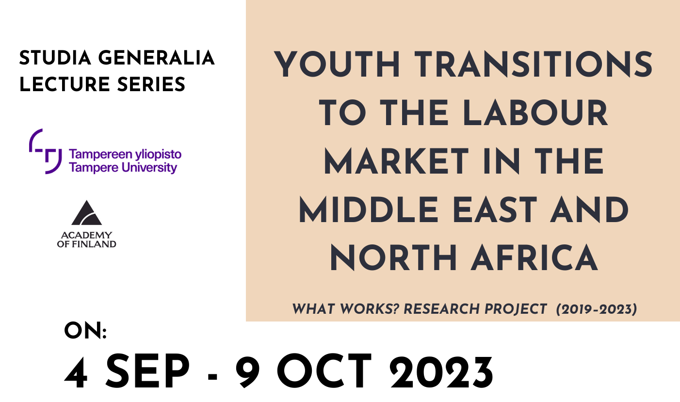 Tampere University in collaboration with the research project What works? Youth transitions from education to employment in the Middle East and North Africa (2019–2023) funded by the Research Council of Finland organizes a hybrid Studia Generalia lecture series in the Fall 2023. As part of it Samuli Schielke will be visiting Tampere University September 11th 2023 and Marko Juntunen October 9th 2023.